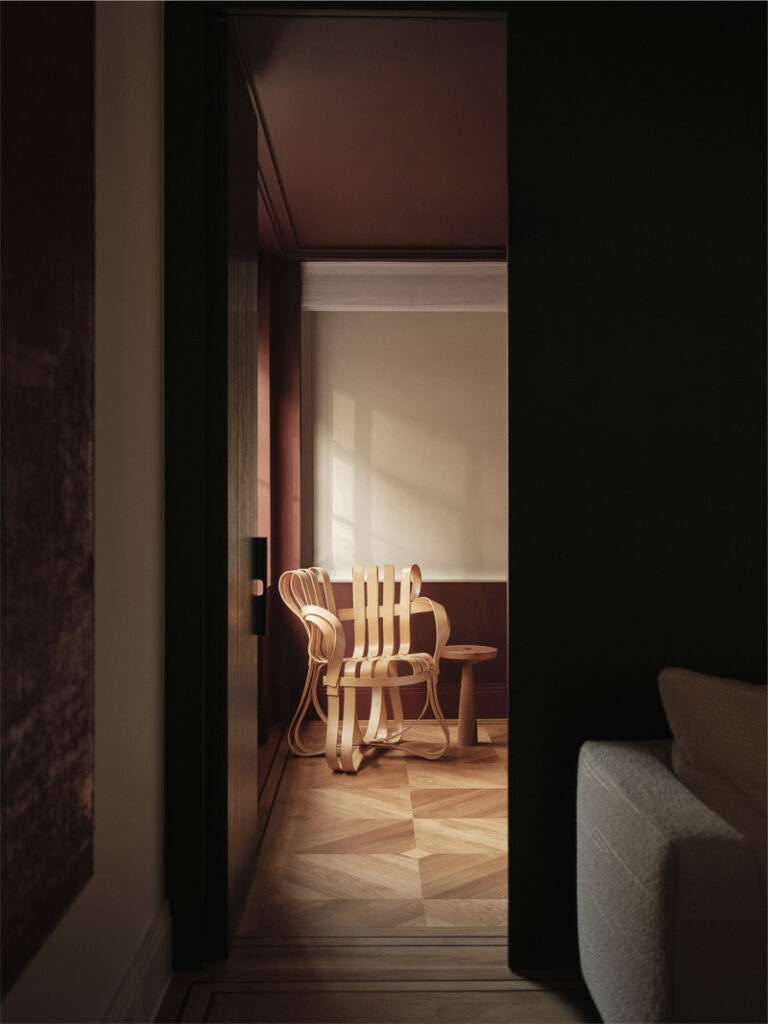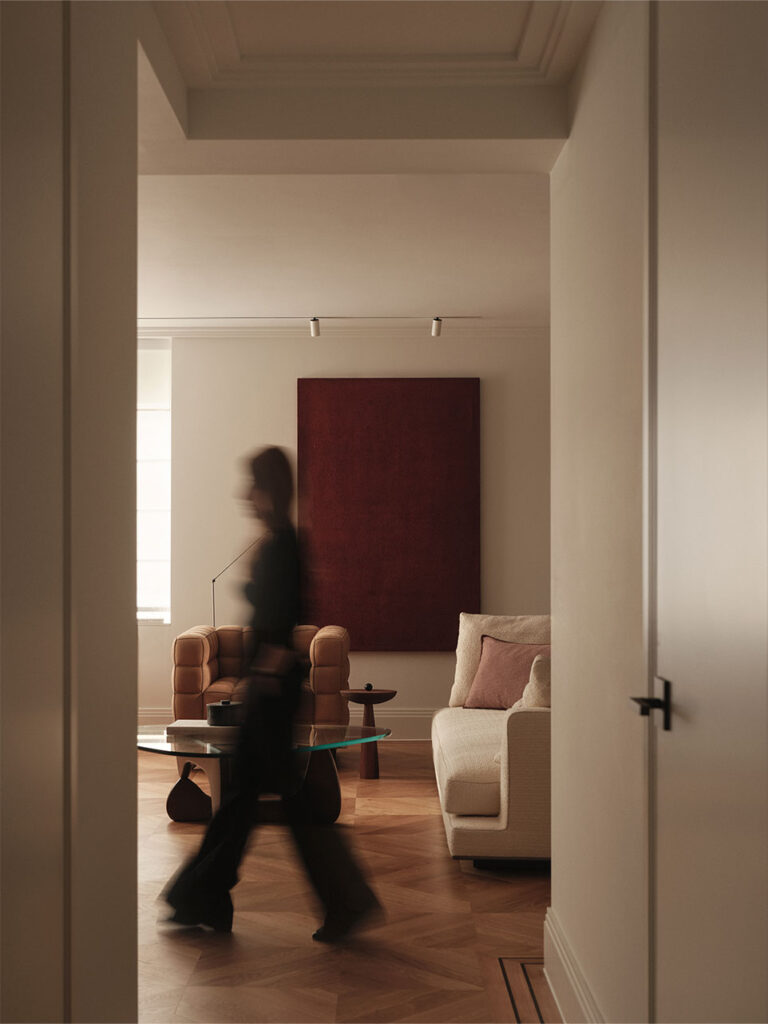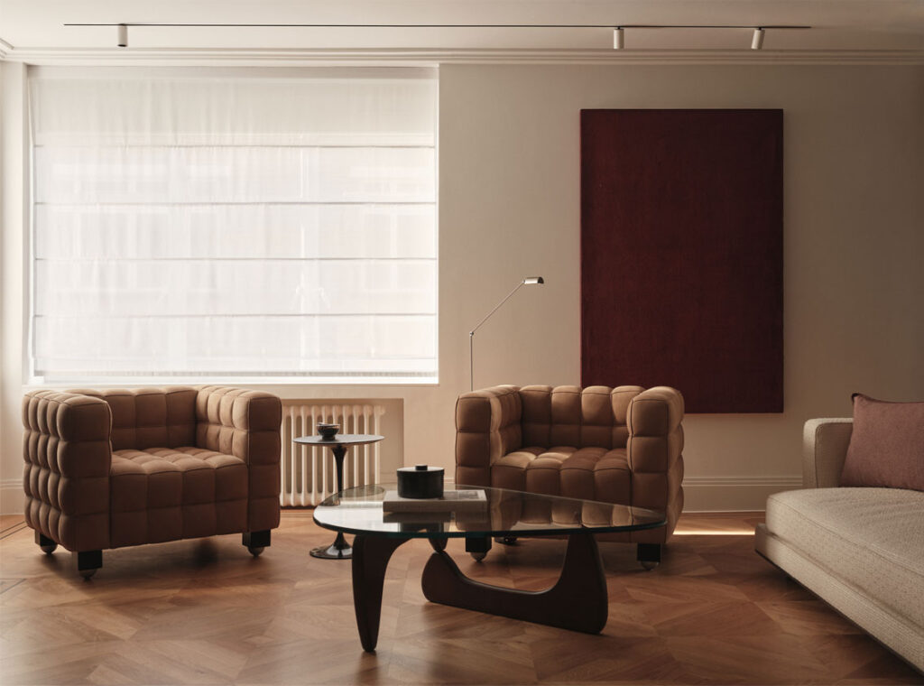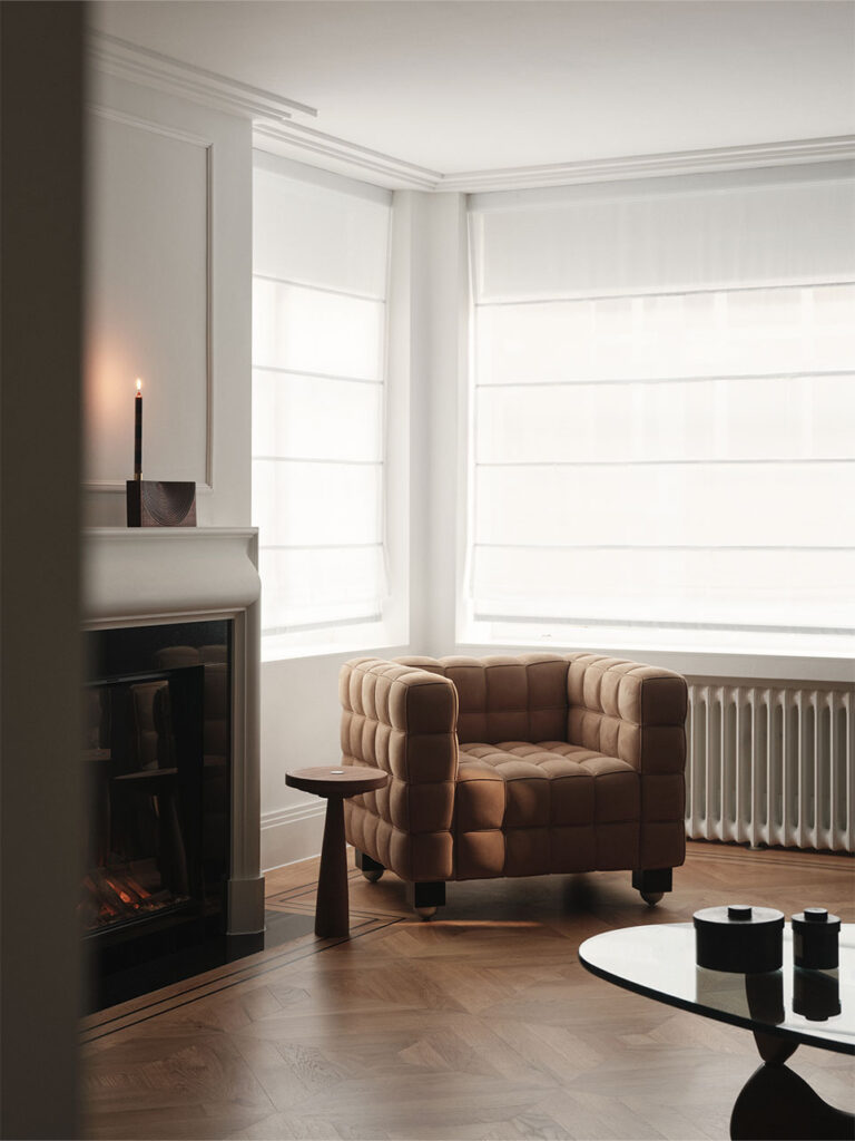 Situated in Knightsbridge, London, this 2025 renovation by Ozge Caglayan Studio Interiors reimagines a two-bedroom flat into a refined urban home. A black wood panel wall with hidden doors anchors the design. Serving both as a headboard within the master bedroom and as a sleek, sculptural feature from the living room perspective. Rich materials, integrated storage, and a bordo-colored hidden kitchen blend form and utility. White walls evoke a gallery-like calm, highlighting art and materials. Furniture includes Kubus armchairs and Cab chairs, blending elegance with sculptural modernism.