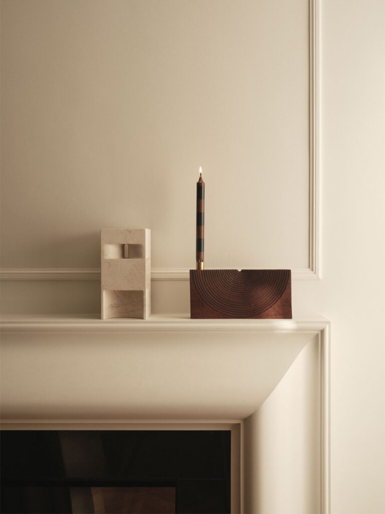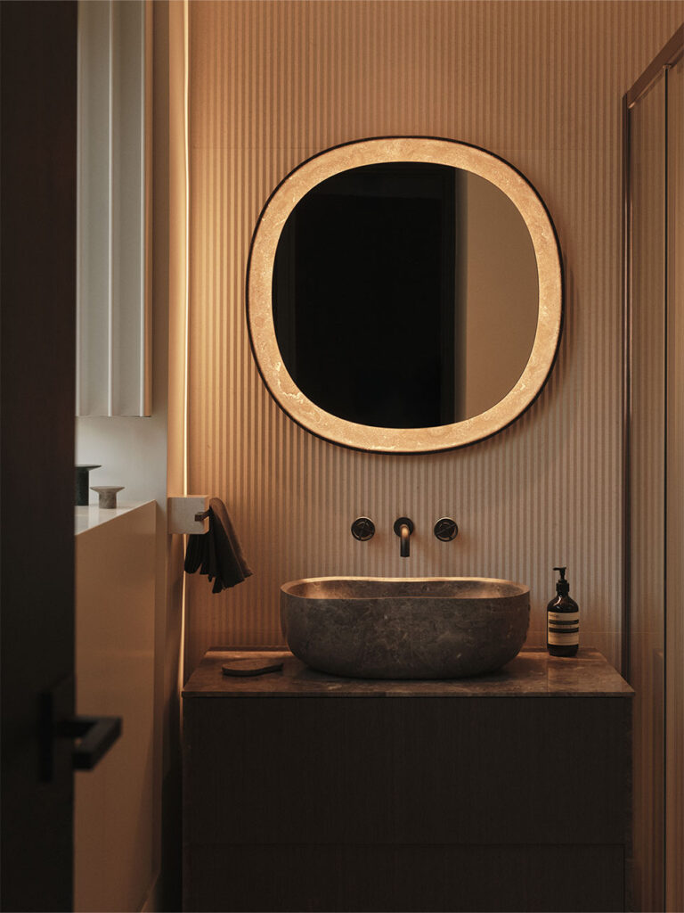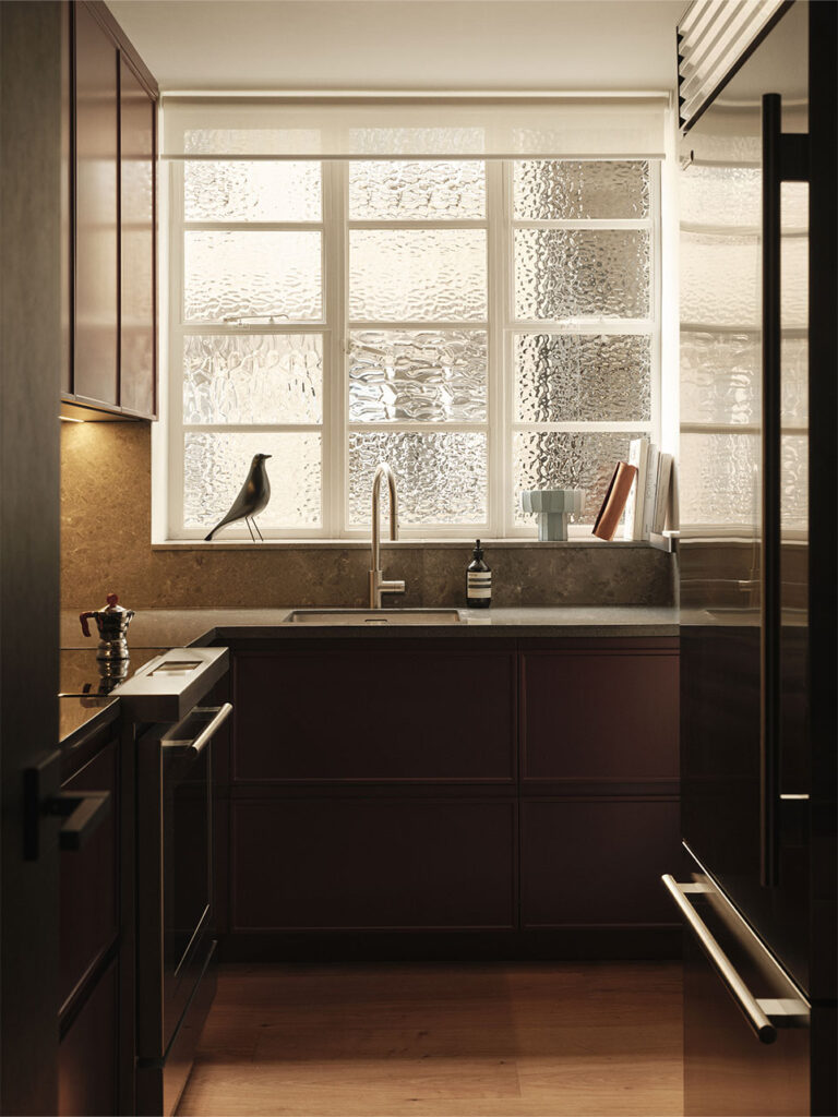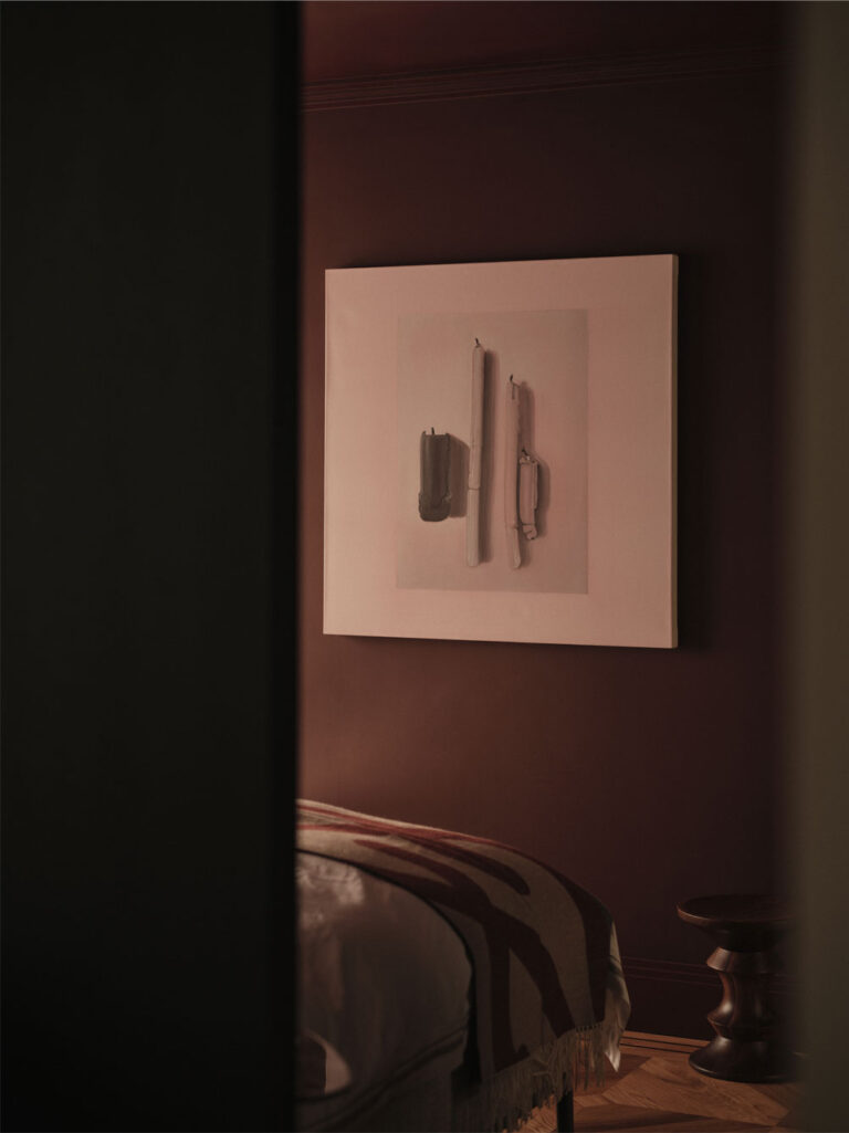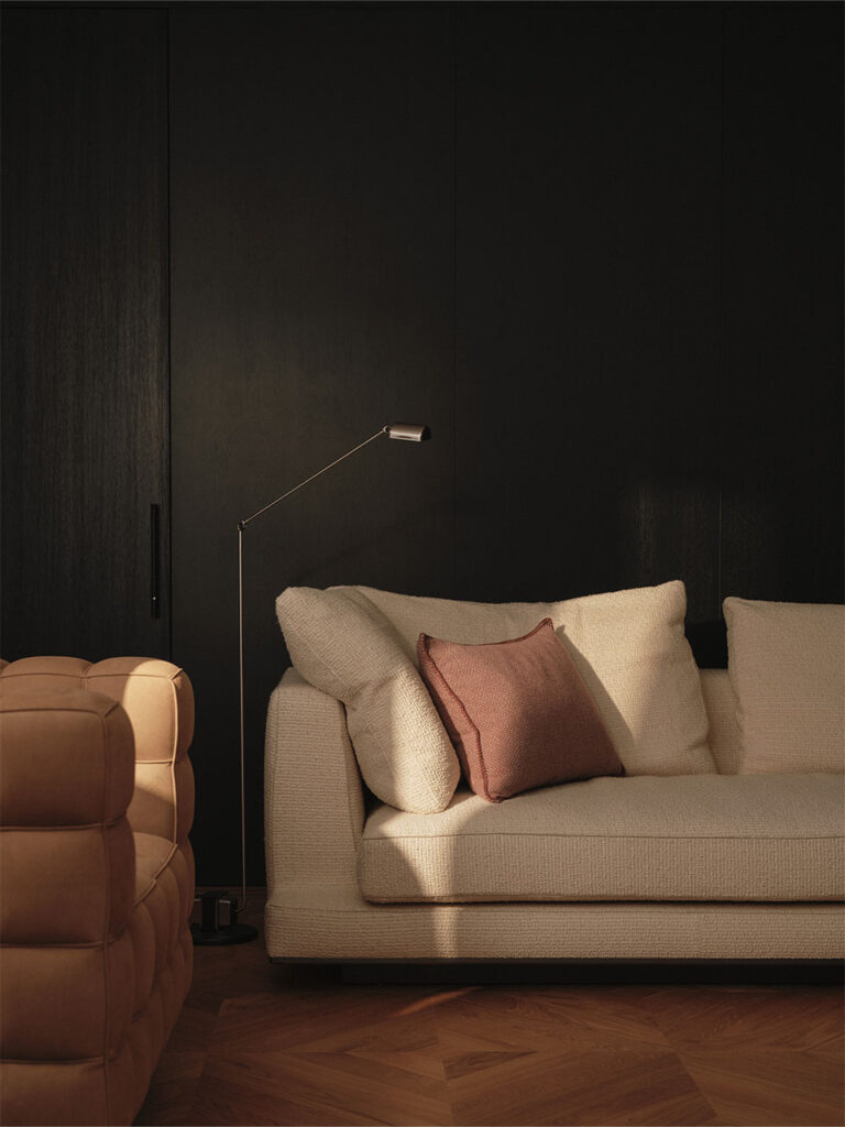 Situated in Knightsbridge, London, this 2025 renovation by Ozge Caglayan Studio Interiors reimagines a two-bedroom flat into a refined urban home. A black wood panel wall with hidden doors anchors the design. Serving both as a headboard within the master bedroom and as a sleek, sculptural feature from the living room perspective. Rich materials, integrated storage, and a bordo-colored hidden kitchen blend form and utility. White walls evoke a gallery-like calm, highlighting art and materials. Furniture includes Kubus armchairs and Cab chairs, blending elegance with sculptural modernism.